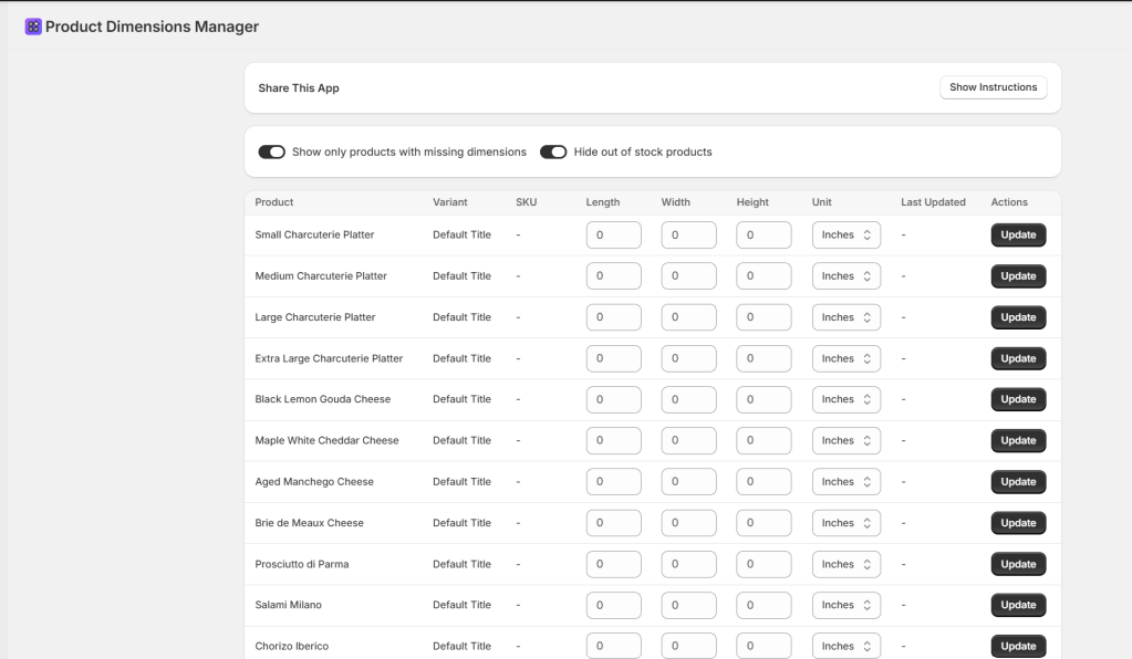 Create a brand new Product Dimensions Manager app. The app should: - Display physical products that require shipping in a table. - Show columns for: Product name, Variant, SKU, Length, Width, Height, Dimension Unit selector (Inches, Centimeters, Meters, Feet), Last Updated, and an Update button. Include filter toggles: 1. "Show only products with missing dimensions" 2. "Hide out of stock products"Logic:- Allow users to enter L, W, and H values and select units. - Store dimensions as custom metafields using the productVariantsBulkUpdate mutation. - Show a "Last Updated" column for tracking modifications.- Include a Share button with instructions in an expandable section. Keep it simple and functional.