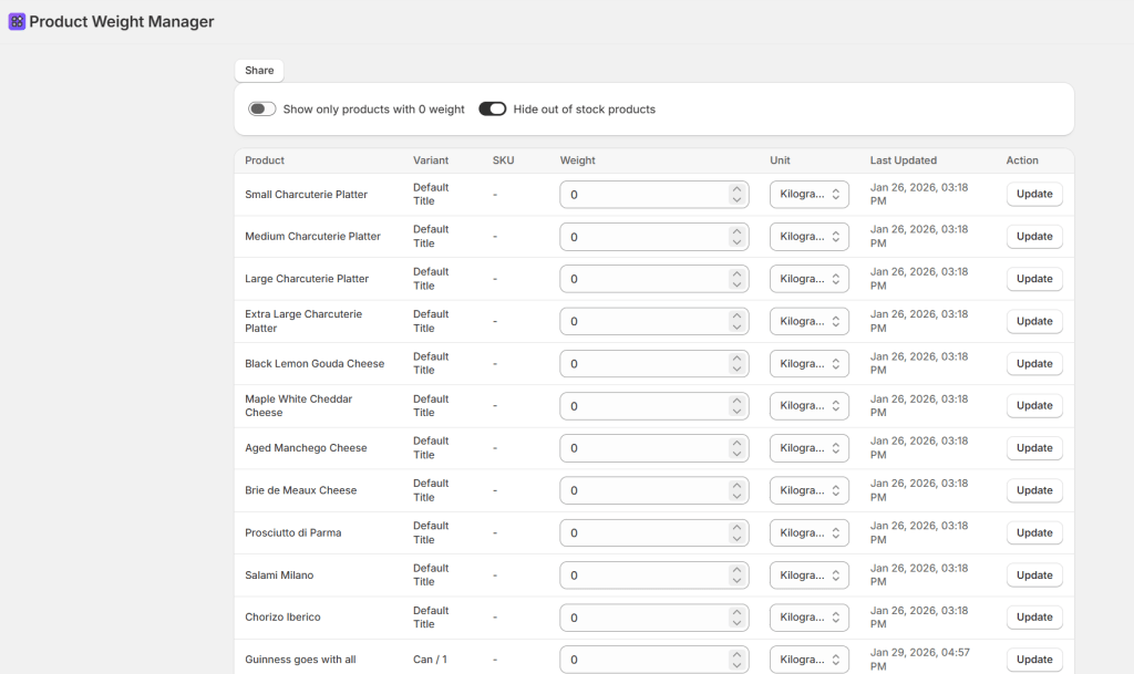 Create a brand new Product Weight Manager app. The app should: - Display physical products that require shipping in a table. - Show columns for: Product name, Variant, SKU, Weight input field, Unit selector (Grams, Kilograms, Ounces, Pounds), Last Updated, and an Update button. Include two filter toggles: 1. "Show only products with 0 weight" 2. "Hide out of stock products"Logic:- Allow users to update weights using the inventoryItemUpdate mutation. - Query inventoryItem.updatedAt for the timestamp.- Include a Share button with an expandable banner. Keep it simple and functional.