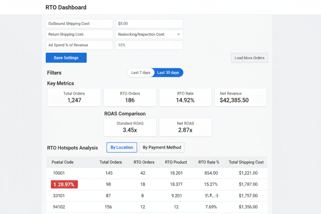Create a brand new app called "RTO Dashboard" to track Return to Origin rates and true profitability.The app should:Display a Main Metrics bar: Total RTO %, Total Orders, Net Revenue, and a side-by-side comparison of Standard ROAS vs. Net ROAS.Include a Hotspot Analysis section with three tabs:"By Location": Table showing postal codes, RTO rates, and total shipping costs. Highlight zones >20% RTO in red."By Product": Table showing SKUs with RTO rates and net profit per SKU. Flag items >30% RTO."By Payment Method": Compare COD vs. Prepaid RTO rates and Average Order Value.Logic:Use orders tagged with "RTO" to identify failed deliveries.Allow user to input default costs: Outbound Shipping, Return Shipping, and Restocking fees.Calculate Net ROAS: (Revenue - Returns - Reverse Logistics Costs) / Ad Spend.Include Date Range filters (7, 30, 90 days).Keep the UI clean using Shopify Polaris components.